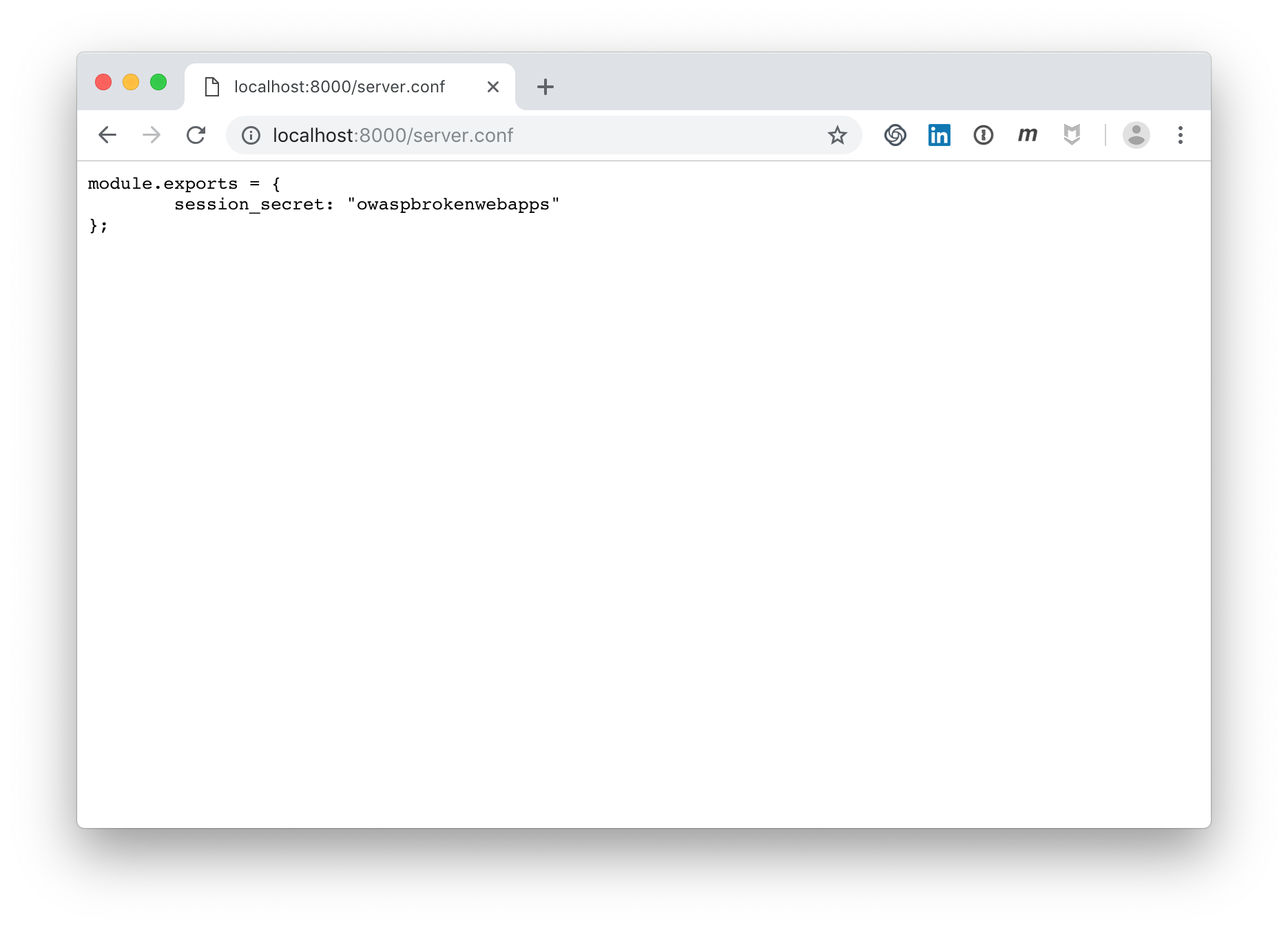 As our application leaks sensitive information in a .conf file, we forbid access to this file extension. The default value of restricted_extensions is a long list of extensions that already contains .conf. Nevertheless, we explicitly set the value .conf for this blog post, as an example. But it’s absolutely ok to not touch this value and to let the default value with numerous extensions take effect.